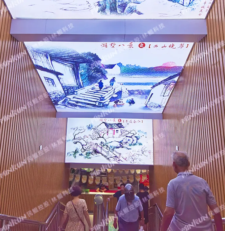 市场的墙面装饰了湖墅八景的主题国画,营造出了一种清新淡雅又富有地域特色的氛围。